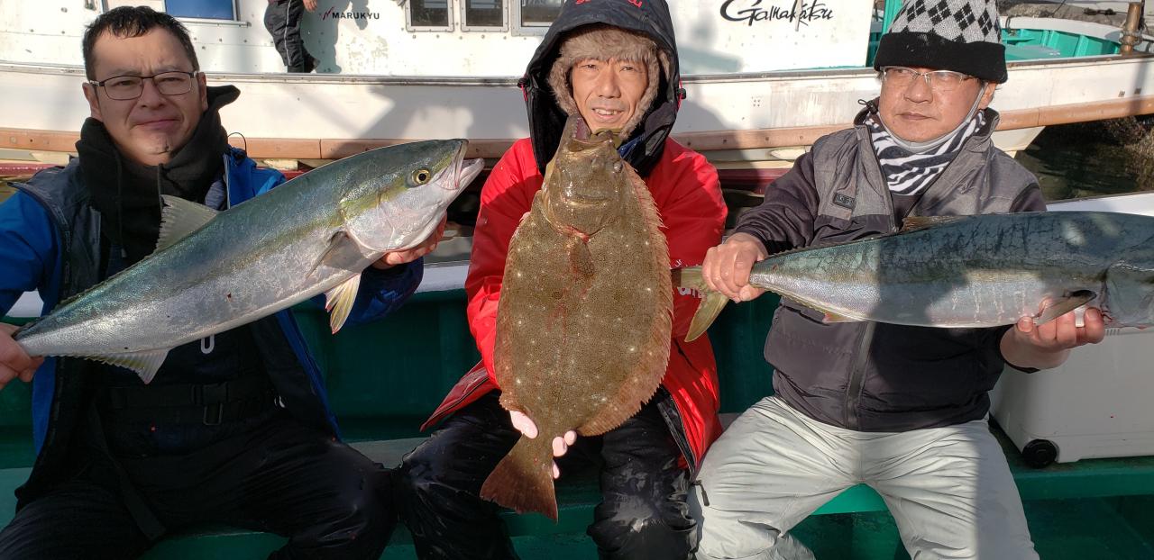 今日は風強く波高く当たり取り辛らかったが良型のヒラメにブリ、メジロが釣れました。